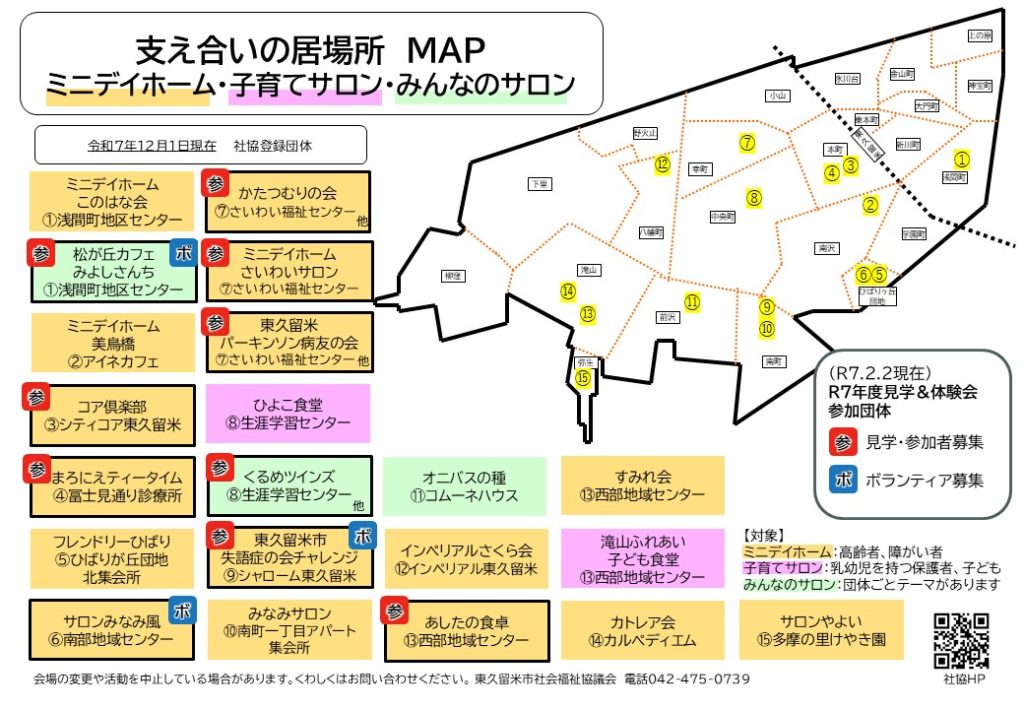 〇さいわい福祉センター(幸町)…かたつむりの会(障がい者ミニデイホーム/参加者)、ミニデイホームさいわいサロン(高齢者ミニデイホーム/参加者)、東久留米パーキンソン病友の会(難病患者ミニデイホーム/参加者)